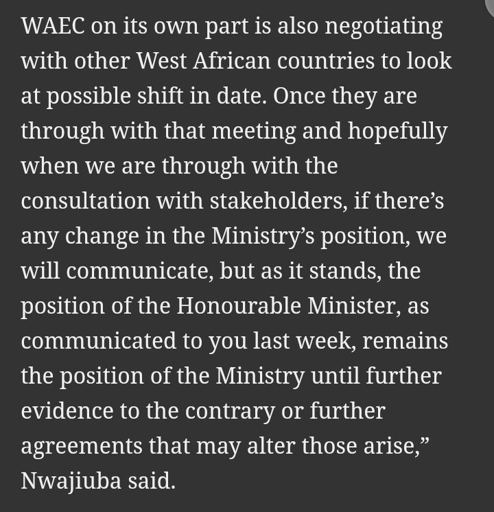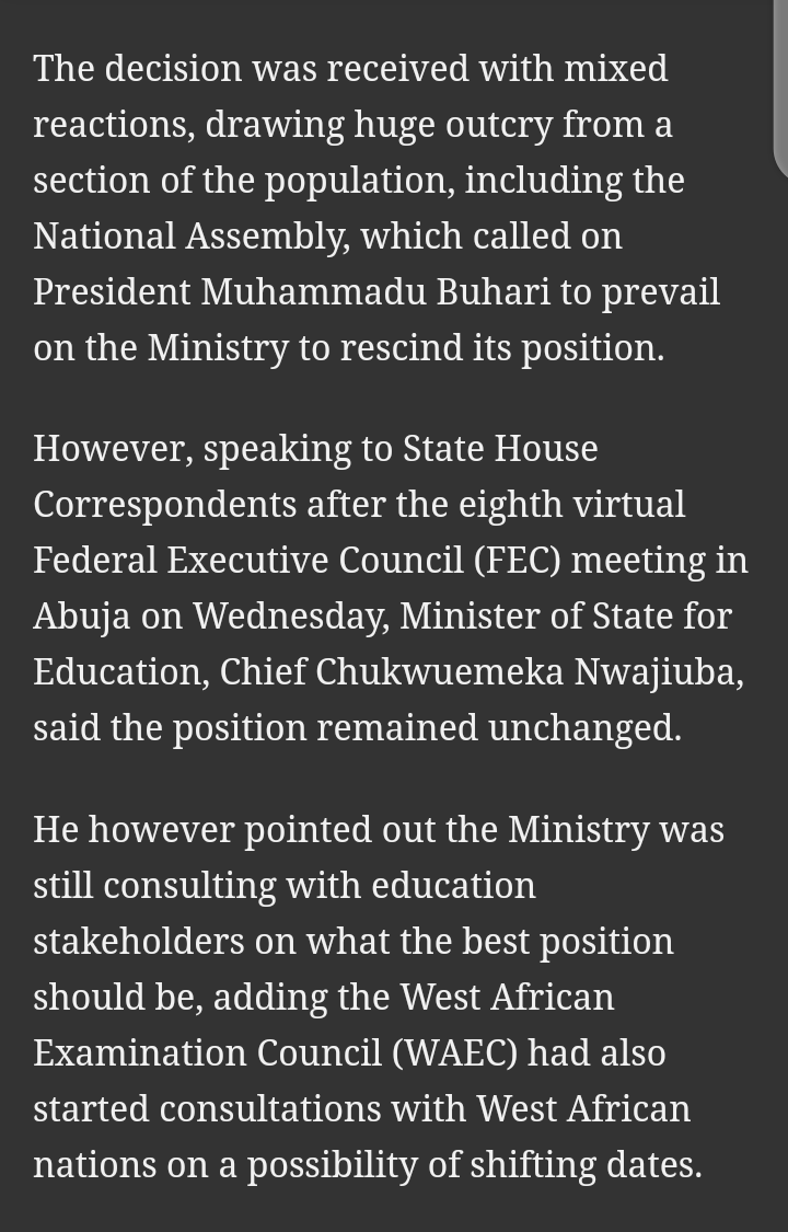 On the other hand, the West African Examinations Council (WAEC) has also spoken to the Federal Government and has said that efforts will be made to speak with other countries in the West Africa to look into shifting the dates of the examinations so that it'll correspond with the plans of the Federal Government.