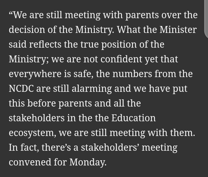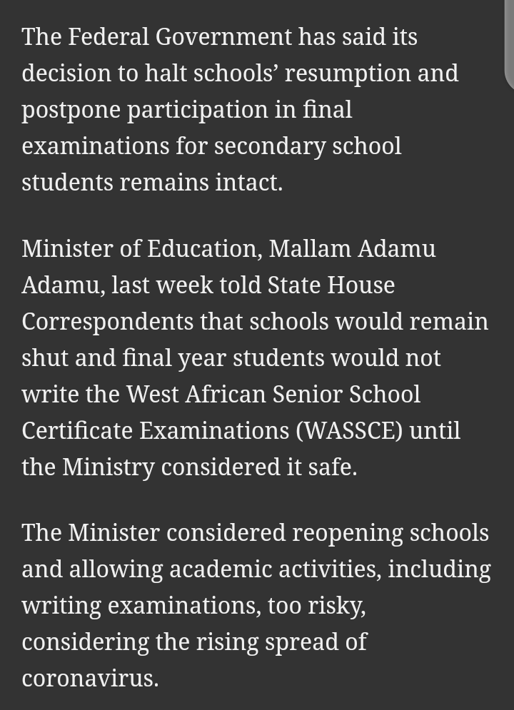 This means that based on the announcement made, despite being persuaded by many, schools will still remain closed till further notice, and all exiting students in the country will not be sitting for the 2020 final examinations due to the current situation in the country.