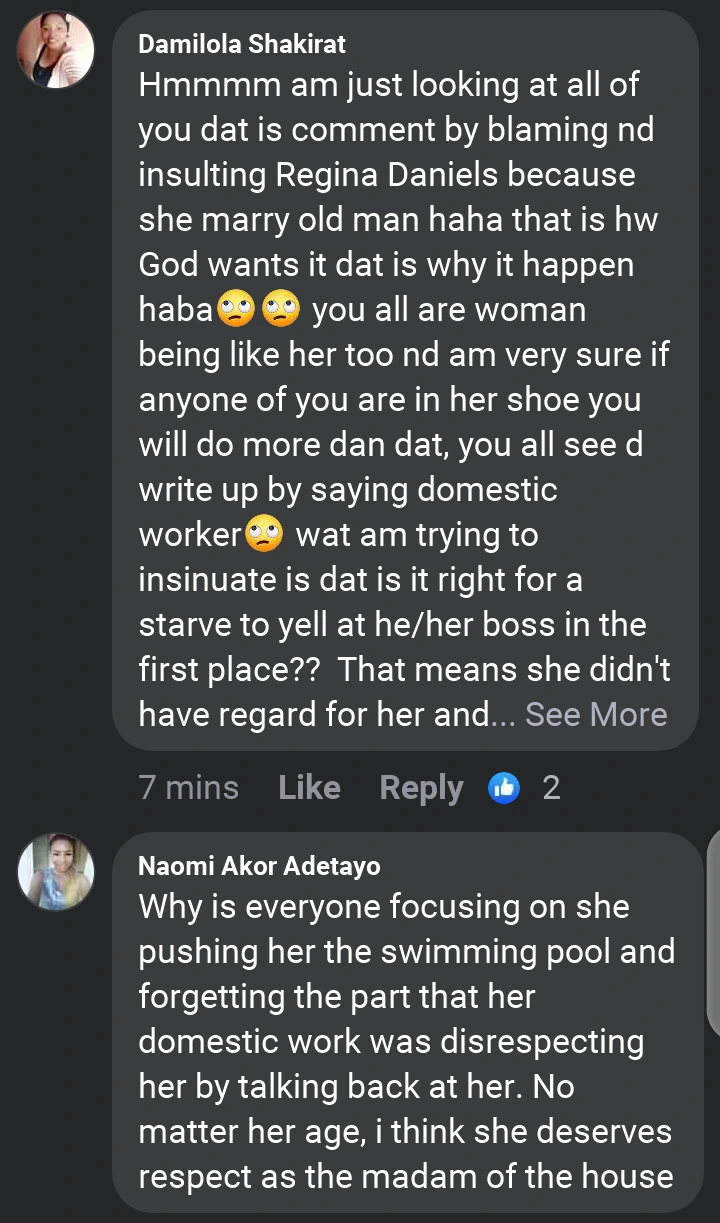 Most Nigerians see's her action to be as a result of pride but some commentors stood against their statement. They said it is wrong for a domestic worker to argue with Regina Daniels and that should be first considered wrong before talking of Regina Daniels action.